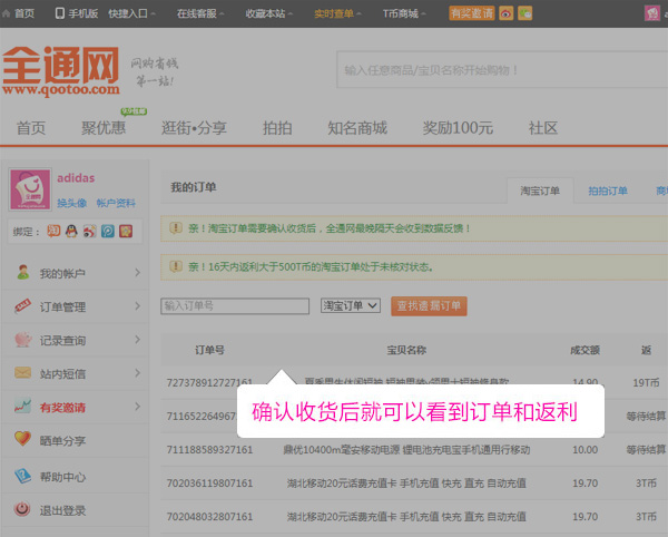 图3:确认收货后回全通网拿返利